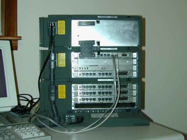 Pictures of a Motorola 900 modular chassis, with a 33MHz MVME187 CPU board, 32MB RAM, 4 MVME332XT serial boards, and an Archive 250MB QIC tape drive.